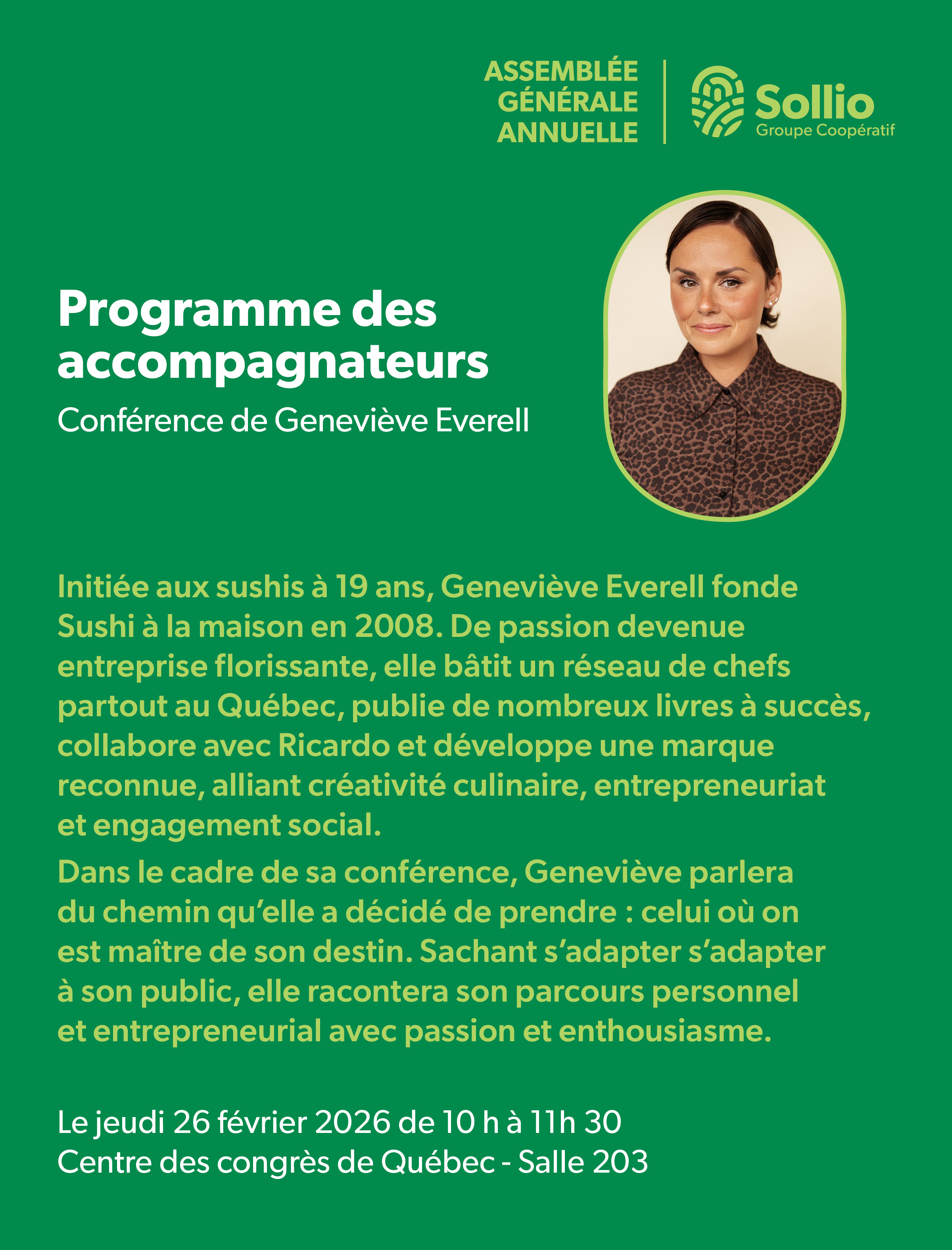 Marie-Pier Béliveau, administratrice au conseil d’administration de Sollio Groupe Coopératif et Andréa Renaud, directrice des Affaires coopératives chez Sollio Groupe Coopératif, exploreront le passé, le présent et l’avenir de l’engagement féminin dans notre secteur. Le tout sera ponctué d’échanges inspirants avec vous.